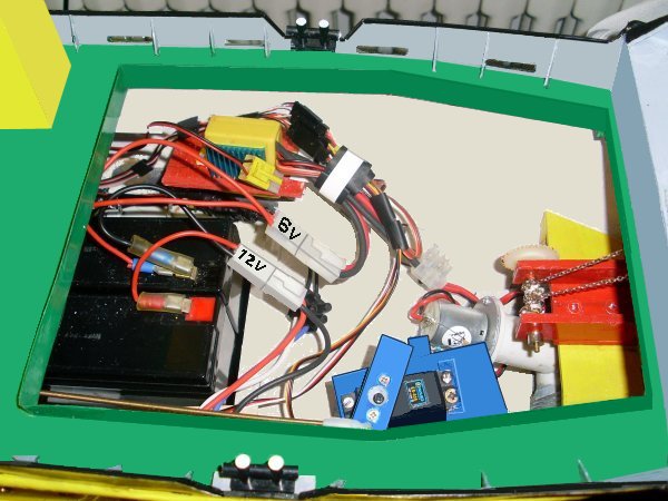 Blau ist der Servo für den Kran. Rechts der Fahrtreger für die Motoren.